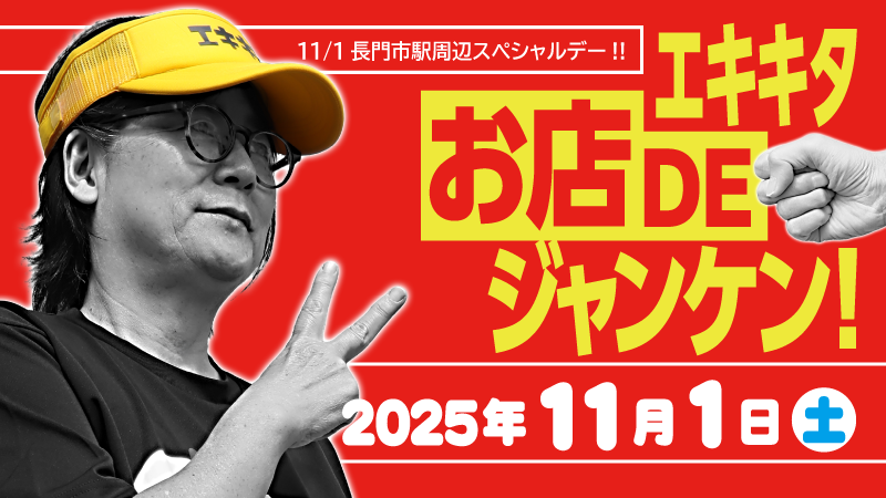 イベント情報 エキキタお店DEジャンケン!(2025年11月1日) 11月1日(土)は12:00~16:00まで長門市駅~駅南周辺で「ながとスイーツさんぽ」、16:00~20:00まで「「エキキタサタデー!」今年もNINA!駅前ツリーだ!お祭りだ!」が行われます。その2事業が合同で「11/1長門市駅周辺スペ... 2025.10.06 イベント情報