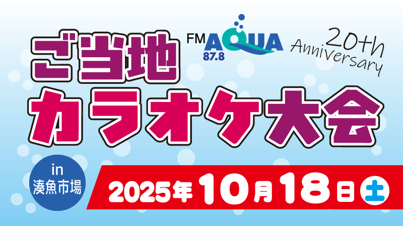 FMAQUA開局20周年を記念し、リスナーの皆様へ感謝を込めて「ご当地カラオケ大会」を開催します!ラジオの生放送と共に、歌声と美味しいグルメで湊の秋を一緒に盛り上げましょう!
